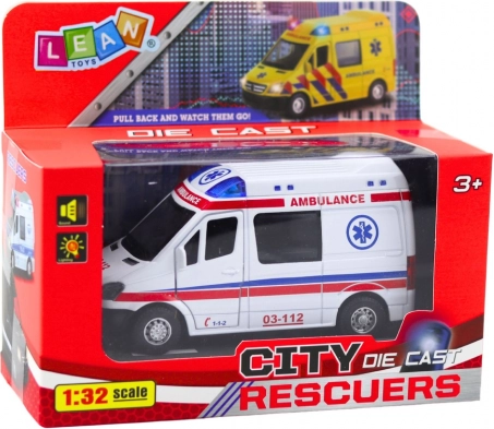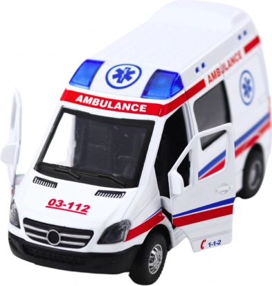 Ambulance en métal 1:32 à propulsion pull-back, lumières et sons – blanche