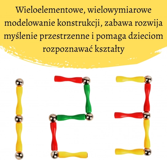 - 38 tiges magnétiques (bleu, jaune, orange), 40 billes métalliques, 50 stabilisateurs transparents pour connexions