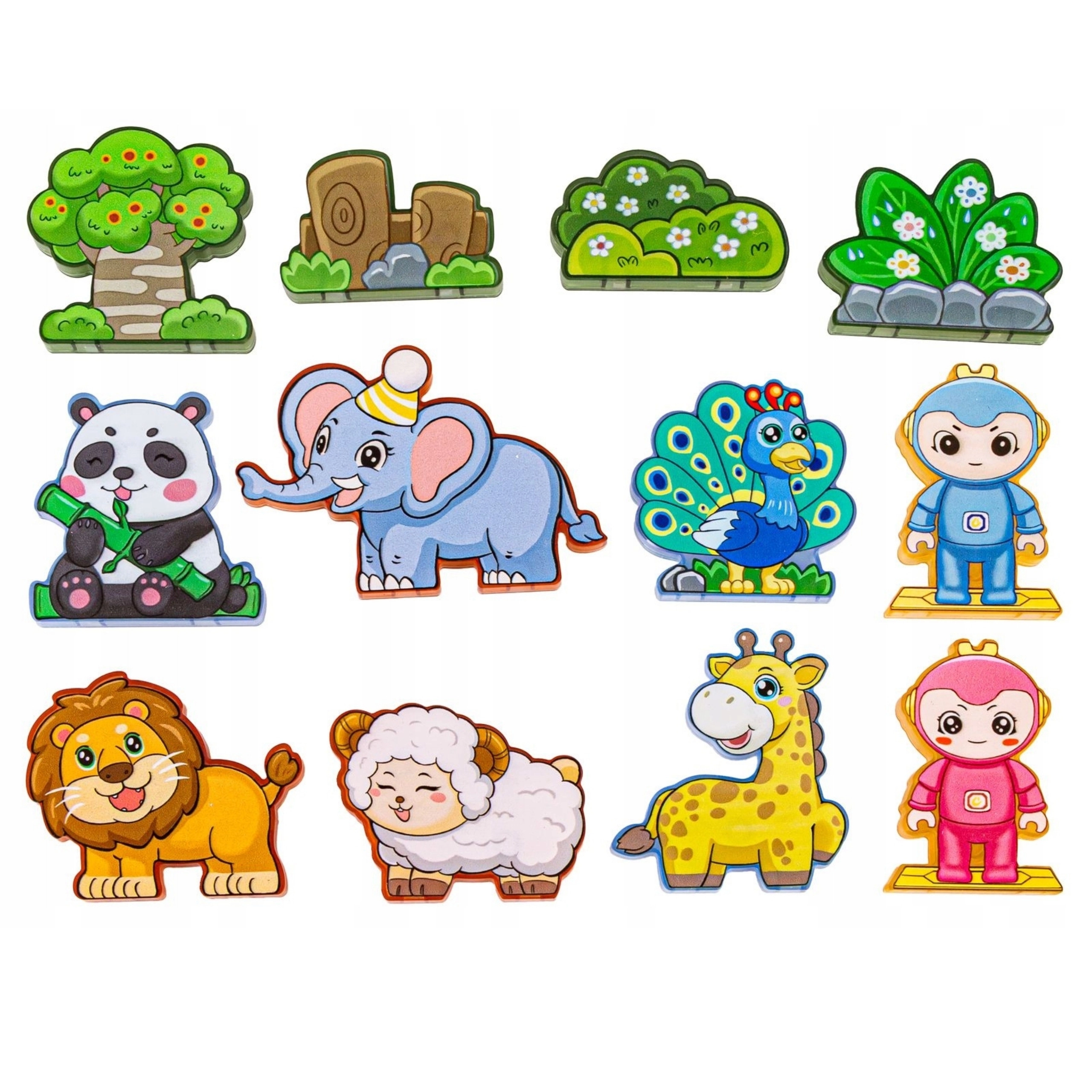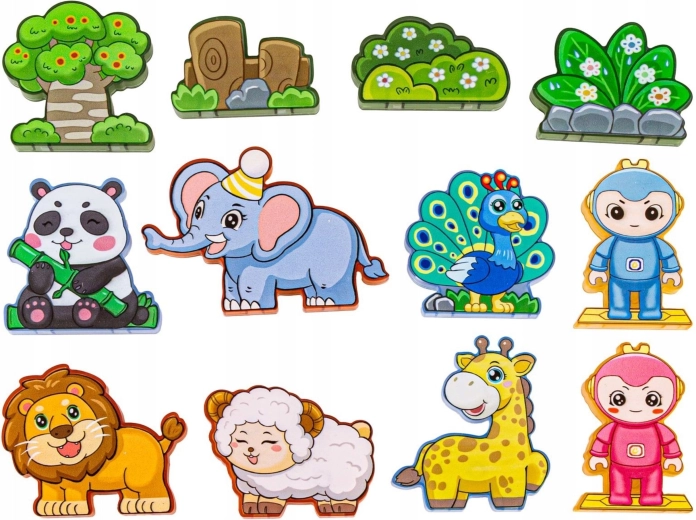 - Pièces variées : formes magnétiques, figurines d’animaux et personnages, accessoires thématiques (arbre, rochers).