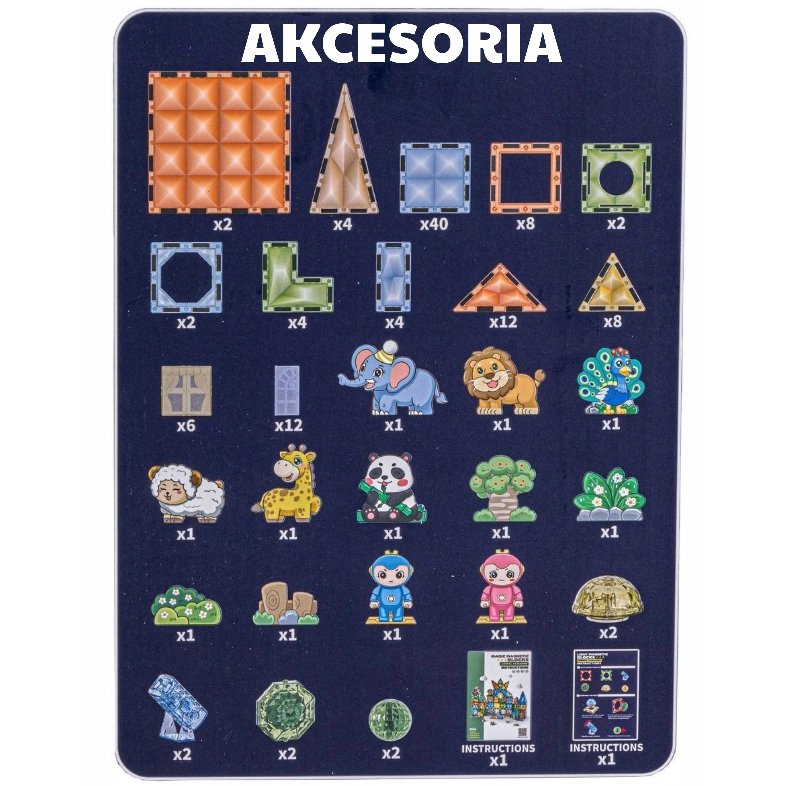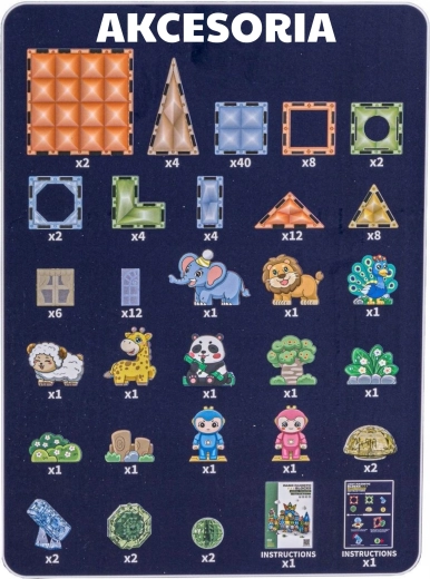 - Éléments magnétiques de formes variées, figurines d’animaux, figurines de personnages, accessoires thématiques (arbre, rochers), notice