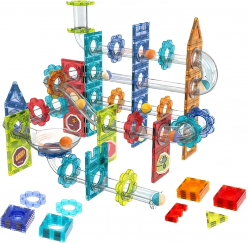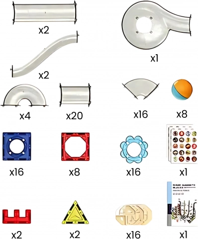 - Pièces magnétiques de différentes formes et couleurs ; éléments transparents de la piste (gouttières, virages, entonnoirs, tunnels) ; billes colorées ; autocollants décoratifs ; notice illustrée