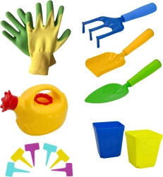 Un tablier au motif dinosaures et un sac à outils aident à garder tout en ordre, tandis que les pots et les étiquettes colorées pour plantes apprennent aux enfants à distinguer et à suivre la croissance. Le set est parfait pour jouer dans le jardin, sur le balcon, dans le bac à sable et au bord de l’eau.