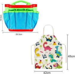arrosoir en forme de fleur, gants de jardin, pelle, pelle/pelle à main, râteau, 2 pots de fleurs (orange et jaune), 6 étiquettes colorées pour plantes, sac à outils, tablier de protection avec dinosaures