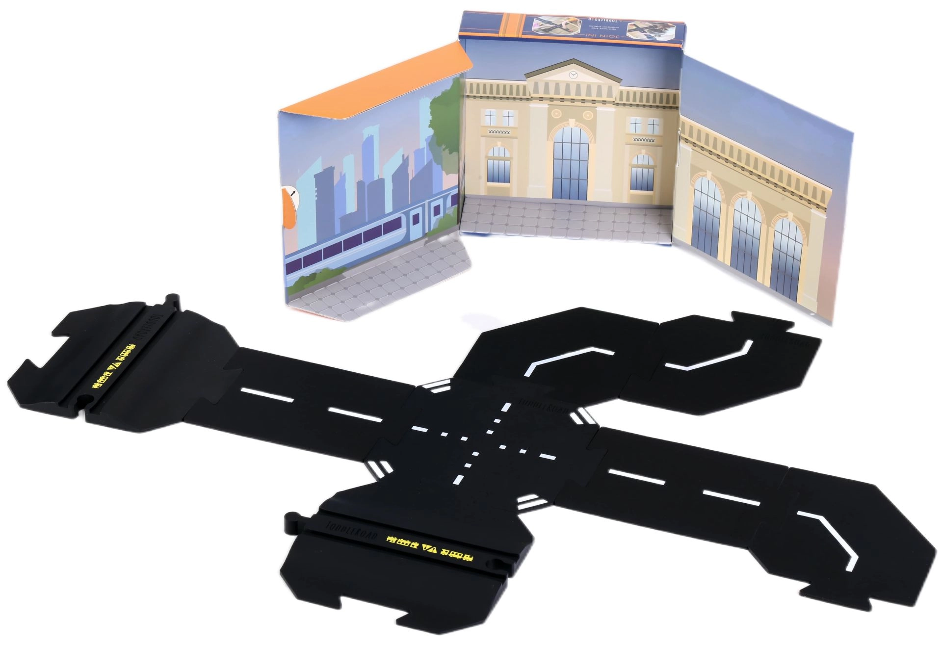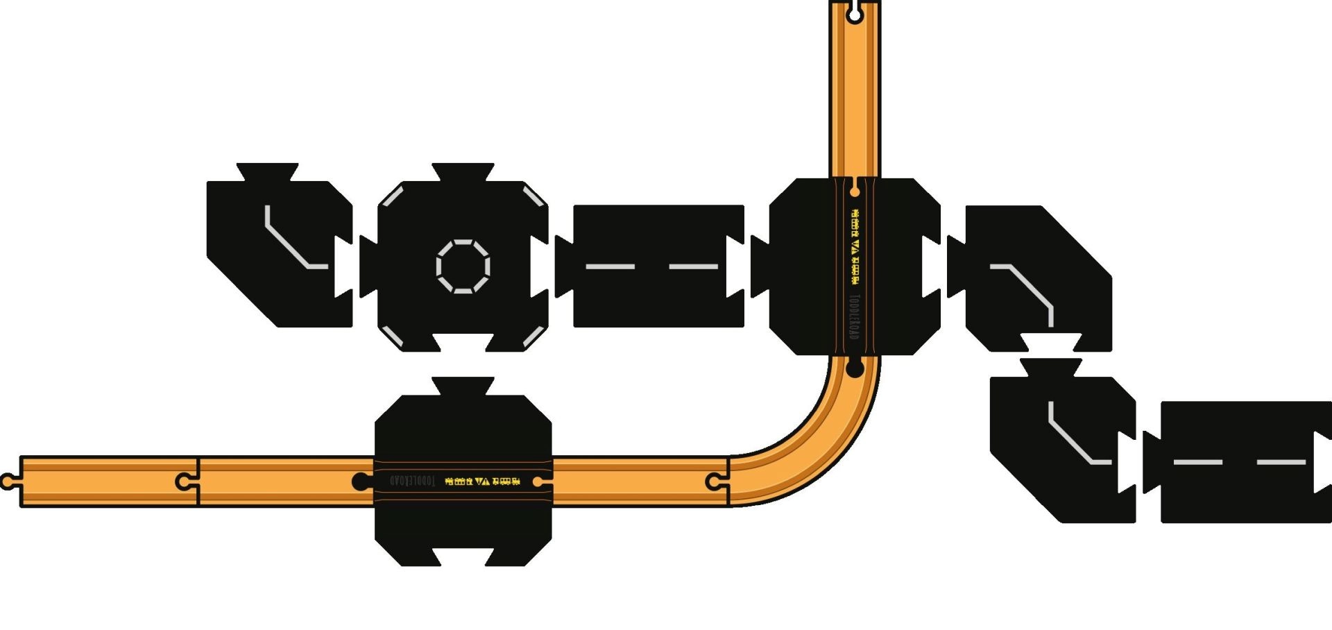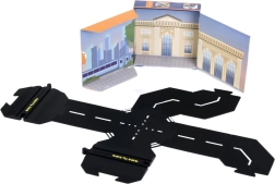 8 pièces en silicone : 2 passages à niveau, 2 routes droites courtes réversibles, 3 virages réversibles, 1 pièce réversible (rond-point / carrefour en X)