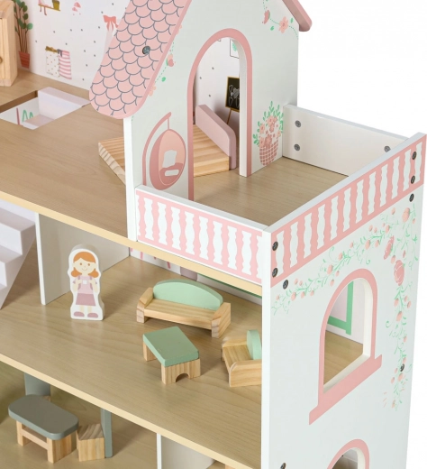 La structure résistante en panneaux MDF, les bords lisses et la fabrication stable assurent un jeu en toute sécurité. La maison mesure 70 cm de haut, idéale pour jouer à plusieurs frères et sœurs. Une armoire ouvrante, des accessoires mobiles et deux figurines en bois favorisent des histoires imaginatives et le développement de la motricité fine.