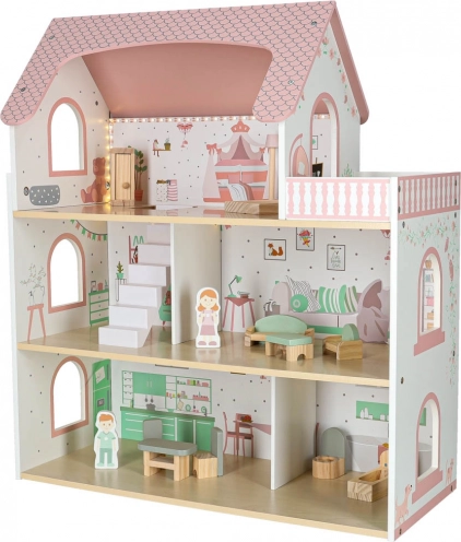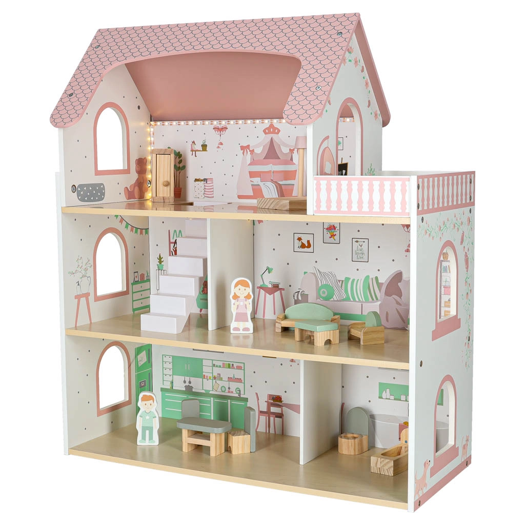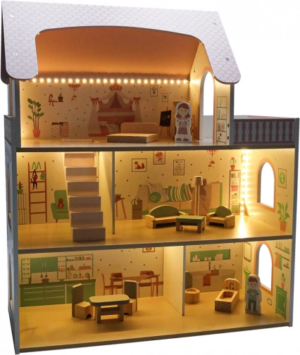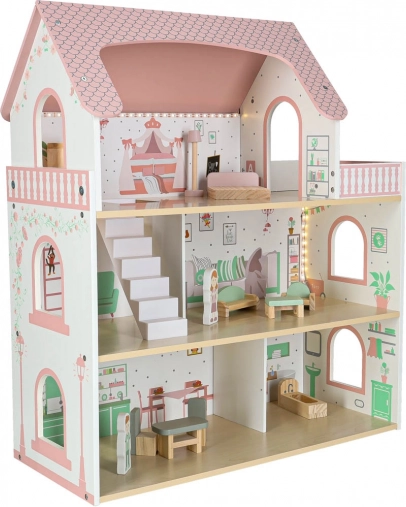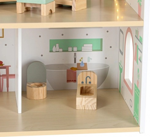 La maison de poupées Lulilo Peonio est une belle demeure à trois étages dans une combinaison rose et menthe, avec impressions d’intérieurs, escalier et balcon. Les petites lumières LED chaudes créent une atmosphère magique pour le jeu du soir et rendent chaque pièce plus chaleureuse. Grâce au riche ensemble de meubles, les enfants aménagent facilement la chambre, le salon, la cuisine et la salle de bain.