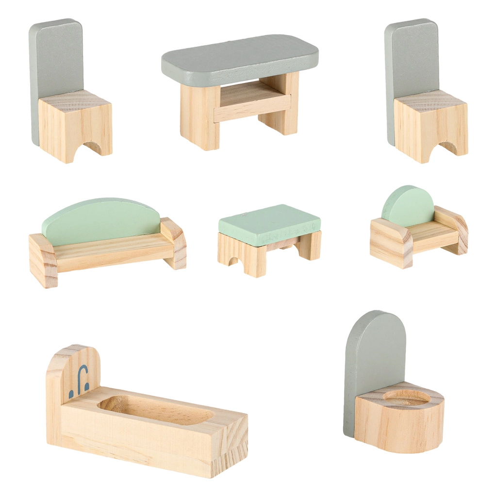 Comprend un lit, une armoire, un canapé, une table avec chaises ainsi que des accessoires de salle de bain. Deux figurines en bois encouragent le jeu de rôle et la créativité.