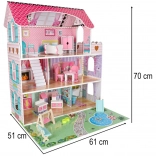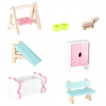 Les accessoires comprennent une table, 2 chaises, une balançoire, des toilettes, une chaise longue, un banc, un lit d’enfant, une lampe, une gamelle pour chien, une armoire, une cuisinière et un lavabo ainsi qu’une adorable figurine de chien. Grâce à la construction robuste en MDF, aux accessoires en plastique et aux vis métalliques, la maison est stable et résistante à un usage quotidien.