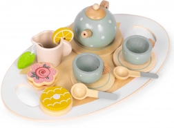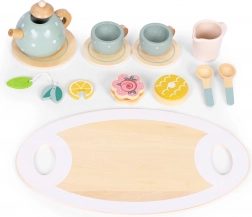 Élégant service à thé en bois avec 14 pièces, un complément idéal pour la cuisine, l’épicerie ou le café des enfants. Tous les éléments sont en bois naturel avec bords arrondis pour un jeu en toute sécurité, et stimulent l’imagination, la coopération et les jeux de rôle. Le set comprend un plateau, une théière, des tasses, des soucoupes, des cuillères, un pot à lait ainsi que des accessoires comme une rondelle de citron, un sachet de thé et des biscuits.