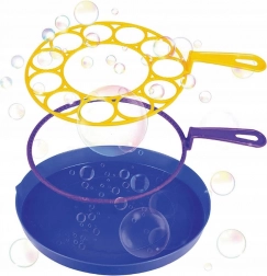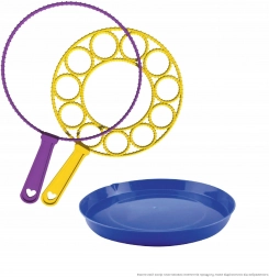 - 2 anneaux (pour grandes bulles et pour de nombreuses petites bulles), bol pour la solution, solution à bulles