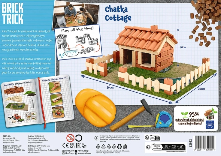 Découvrez le kit de construction Trefl Brick Trick Eco Chata, qui permet aux enfants de bâtir pas à pas, des fondations jusqu’au modèle final avec toit, clôture et cour. De vraies mini-briques, du bois et des accessoires décoratifs composent l’aspect authentique d’une petite maison de campagne. Donnez vie à la construction terminée avec des figurines en papier et des accessoires thématiques.