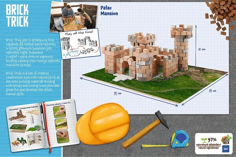 Devenez bâtisseur et construisez votre propre château XL avec de véritables briques en argile et des planchettes en bois. Les ensembles TREFL BRICK TRICK développent les compétences manuelles, la créativité et la concentration et, grâce à la colle soluble dans l’eau, peuvent être réutilisés. Suivez les instructions ou créez votre solution originale et complétez la construction avec les décorations et figurines incluses.
