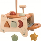 Ce jouet polyvalent réunit trois activités appréciées en un ensemble astucieux. La partie supérieure sert de marteau à taper avec deux billes colorées et un maillet. Sur les côtés, vous trouverez des ouvertures pour l’insertion de formes, favorisant la pensée logique et la reconnaissance des formes. Il comprend également un xylophone amovible avec mailloche pour les premières expériences musicales et la découverte des sons.