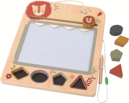 L’ensemble comprend également 4 tampons magnétiques – cercle, carré, triangle et pentagone. Les enfants apprennent ainsi de manière ludique les formes géométriques de base et développent leur perception spatiale. La finition en bois est agréable au toucher et résistante à une utilisation quotidienne.