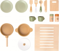 Un riche ensemble d’accessoires est inclus : assiettes, tasses, poêle, casserole avec couvercle, sel et poivre, planche à découper, ustensiles de cuisine et grille de four. La structure en bois robuste et les peintures non toxiques garantissent sécurité et longévité.