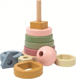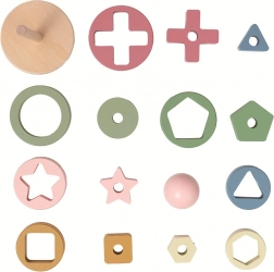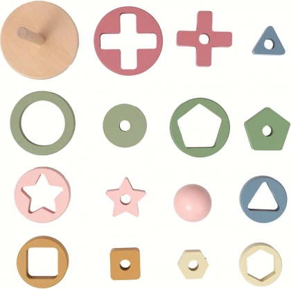 Les enfants empilent progressivement sur une tige en bois des anneaux de tailles différentes, chacun comportant une découpe au centre – étoile, carré, triangle et d’autres formes. Lorsque toutes les pièces sont correctement en place, on ajoute la tête ronde et le petit bonhomme est complet. Le jeu favorise naturellement la concentration, la patience et la joie de la découverte.