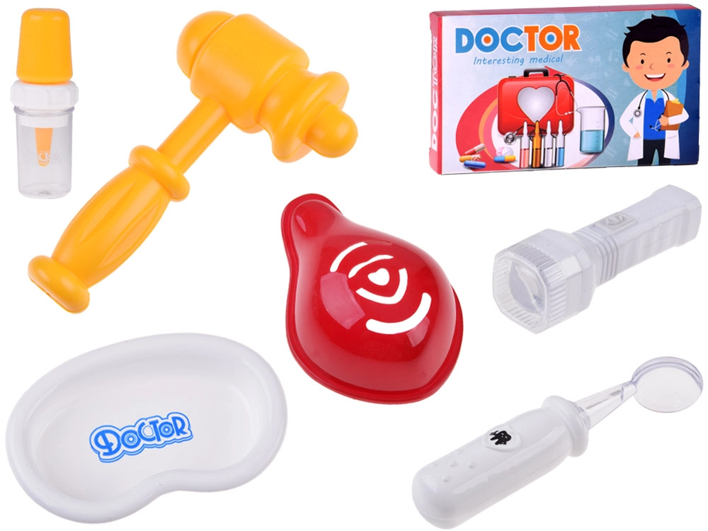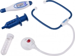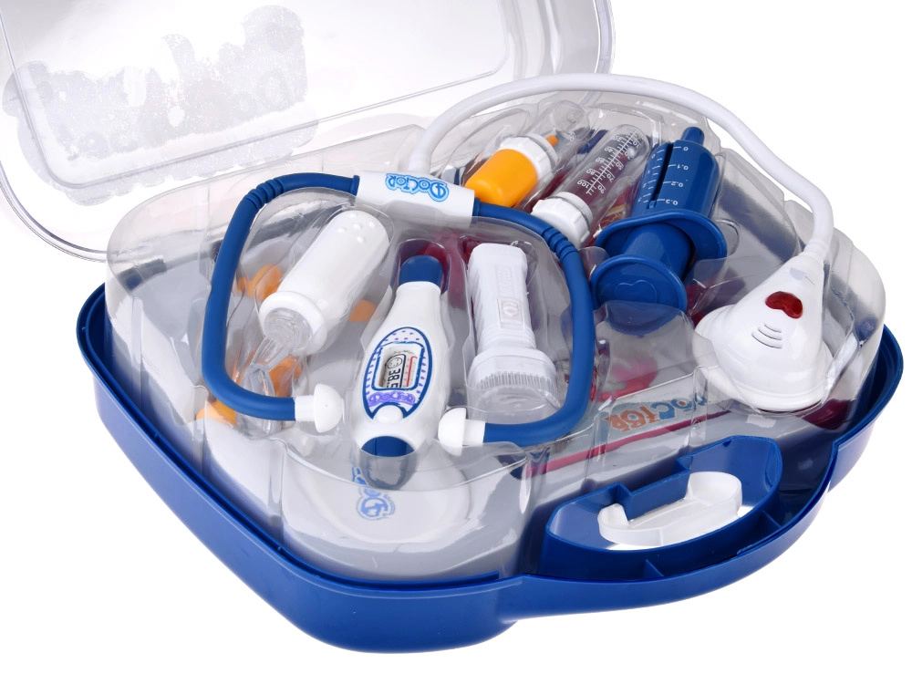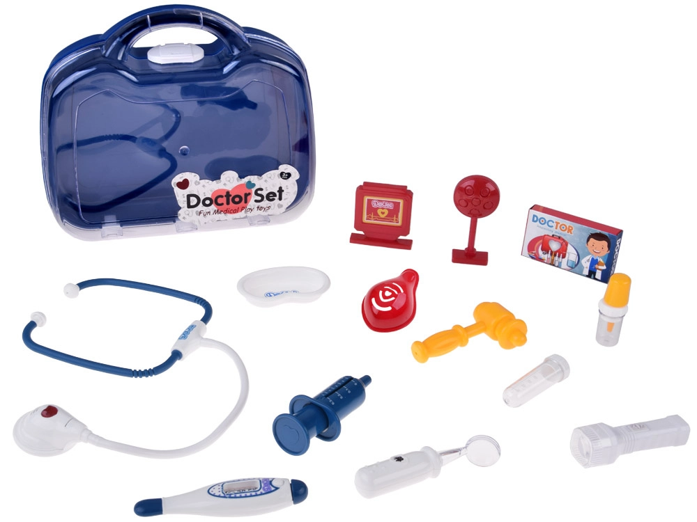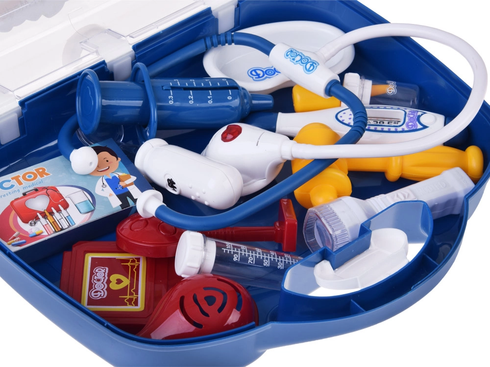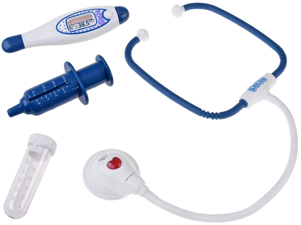 - Stéthoscope (avec son), lampe lumineuse, thermomètre numérique (avec indicateur rotatif), seringue à piston mobile, marteau à réflexes, otoscope/lampe, miroir laryngologique, éprouvettes et pipette, plateau « haricot », carte DOCTOR, boîte « médicaments », autres petits accessoires