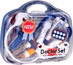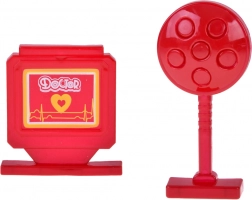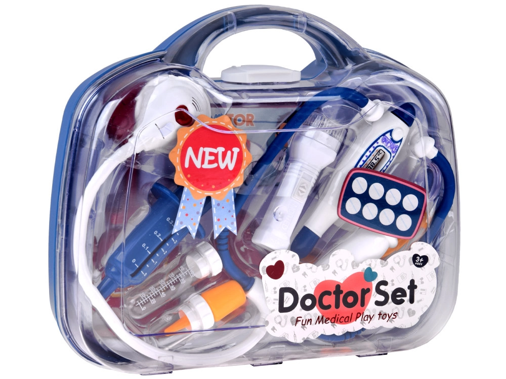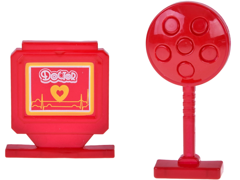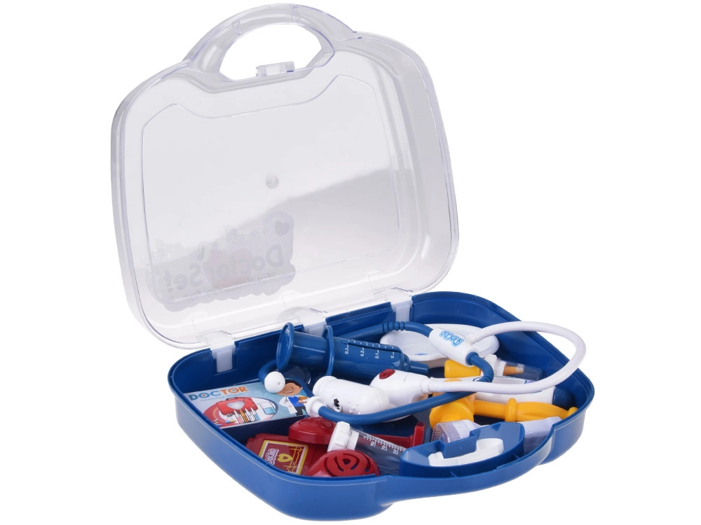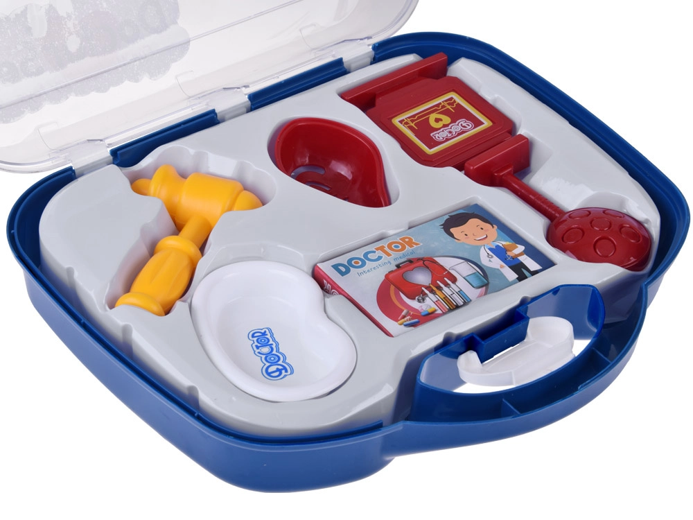 - Stéthoscope (avec son), lampe lumineuse, thermomètre numérique (avec indicateur rotatif), seringue à piston mobile, marteau à réflexes, otoscope/lampe, miroir laryngologique, éprouvettes et pipette, plateau « haricot », carte DOCTOR, boîte « médicaments », autres petits accessoires