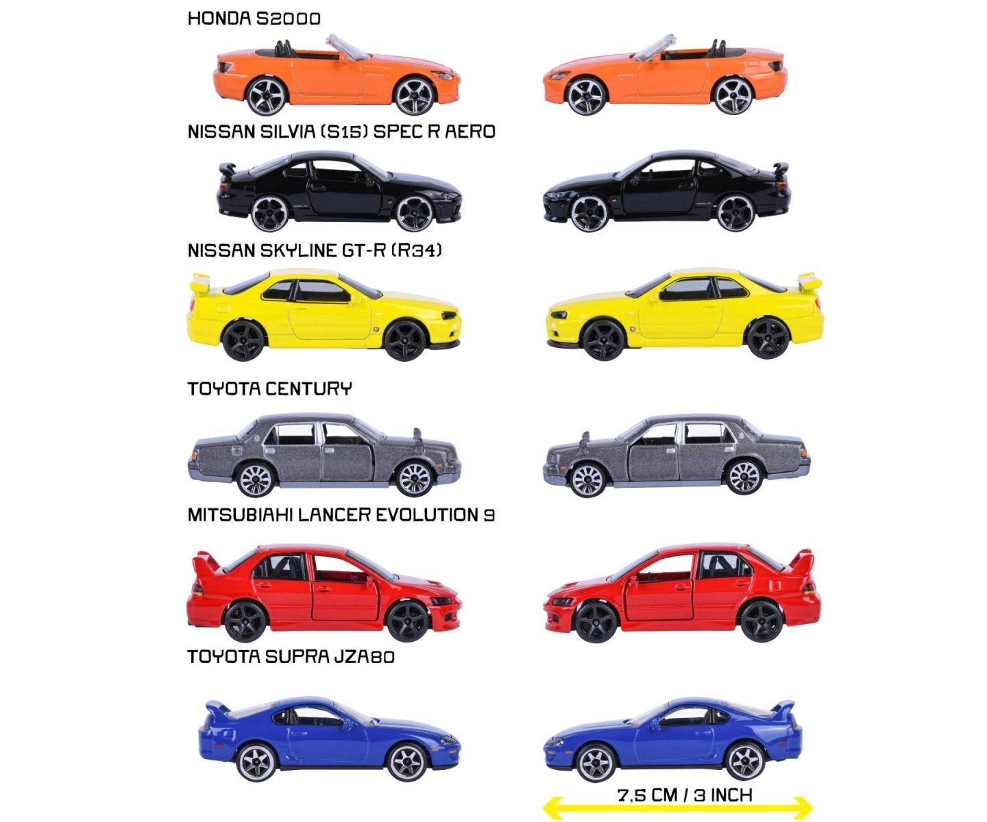 Grâce aux parties ouvrantes (p. ex. portes, capot ou coffre) et aux roues libres, ces miniatures sont parfaites pour le jeu comme pour l’exposition de collection. L’emballage peut contenir l’un des modèles populaires des marques NISSAN, MITSUBISHI, TOYOTA ou HONDA de la série Japan en édition limitée.