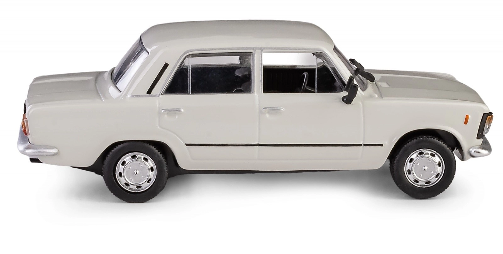 Ce modèle authentique s’inspire de la version modernisée MR’75 de la célèbre « grande Fiat », produite plus tard sous le nom FSO 125p. Il se distingue par des proportions réalistes, des détails chromés de pare-chocs, des optiques soigneusement façonnées et un intérieur visible à travers des vitres transparentes. La teinte gris cendré souligne le caractère classique de la voiture.