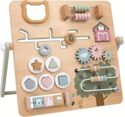 Des roues dentées rotatives, des pistes coulissantes, un labyrinthe de fils et de perles ainsi qu’un boulier encouragent la motricité fine, la coordination œil–main et le raisonnement logique pendant le jeu.