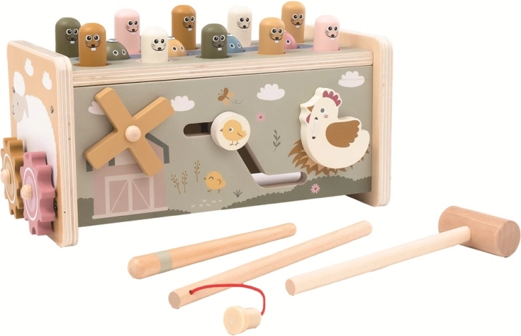 Découvrez un jouet en bois ludique qui réunit une tape-taupe, une pêche magnétique, des rouages, une hélice rotative, un labyrinthe coulissant avec poussin et un xylophone coloré. Cet ensemble multifonction aux couleurs pastel stimule la motricité fine, la coordination œil-main, la pensée logique ainsi que la perception sensorielle et divertit les enfants pendant de longues heures.