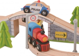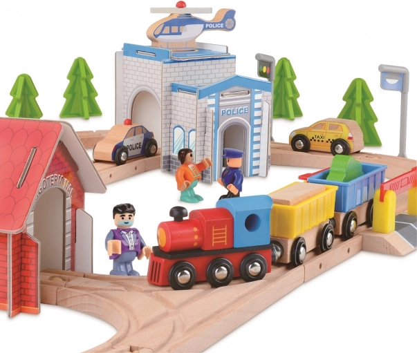 Ce circuit minutieusement conçu offre un univers ferroviaire complet : locomotive avec wagons, voitures, personnages, station de police, héliport, arbres et signalisation. Les enfants peuvent charger le fret, franchir le pont surélevé, s’arrêter à la station et traverser en toute sécurité le passage à niveau avec barrières. Chaque trajet devient une nouvelle histoire, développant la logique, la coordination œil-main et la communication lors du jeu en groupe.