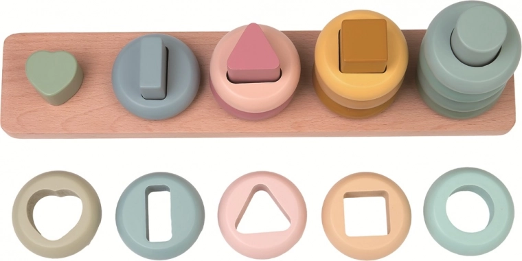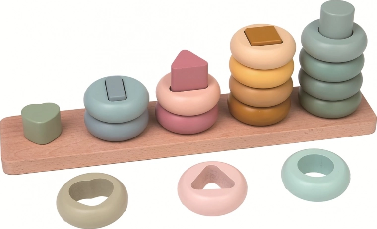 Le bois naturel de qualité, aux bords arrondis et à la surface lisse, assure un jeu en toute sécurité, tandis que les tons pastels et terreux stimulent la perception des couleurs sans sur‑stimulation. Le nombre différent de pièces sur les colonnes encourage en outre l’apprentissage des quantités et la comparaison des tailles.