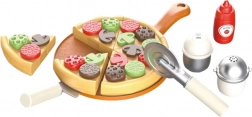 Pizza en bois/plastique en segments avec toppings amovibles, couteau à pizza et pelle de service pour développer la créativité et la motricité fine.