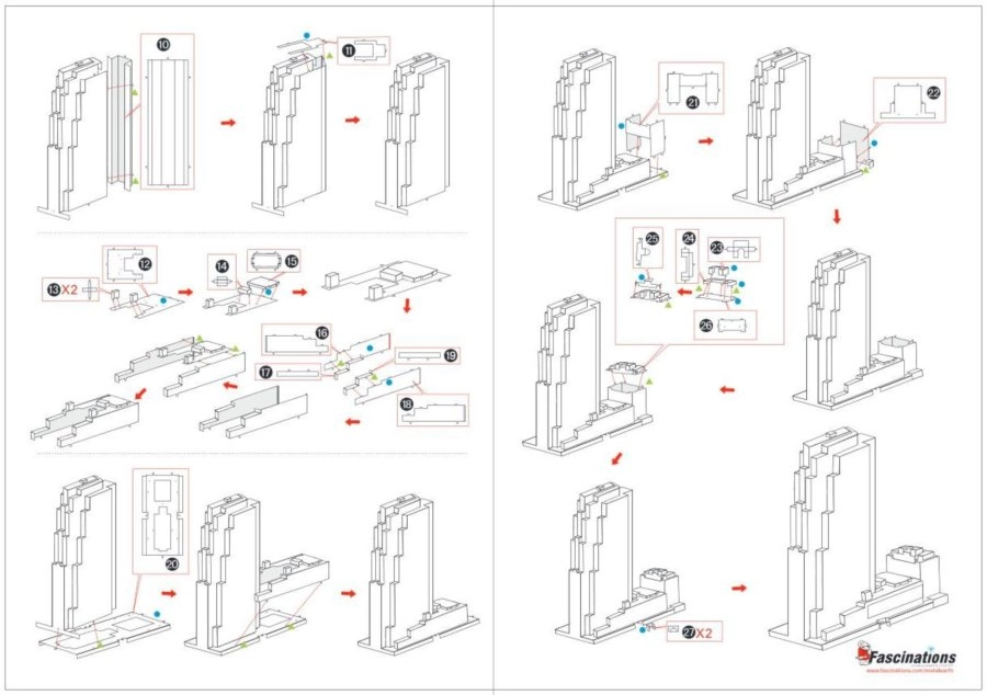 L’assemblage se fait sans colle : détachez les pièces des plaques, reliez-les à l’aide de languettes et d’enclipsages, puis pliez-les avec de petites pinces pour un maintien solide. Grâce à la gravure laser, les détails caractéristiques du célèbre gratte-ciel de Midtown Manhattan ressortent à merveille.