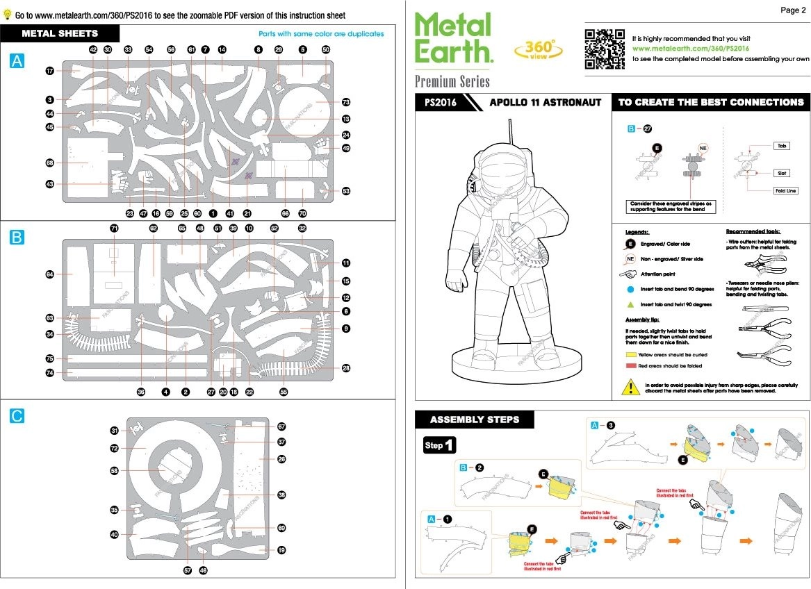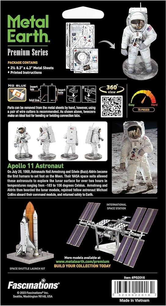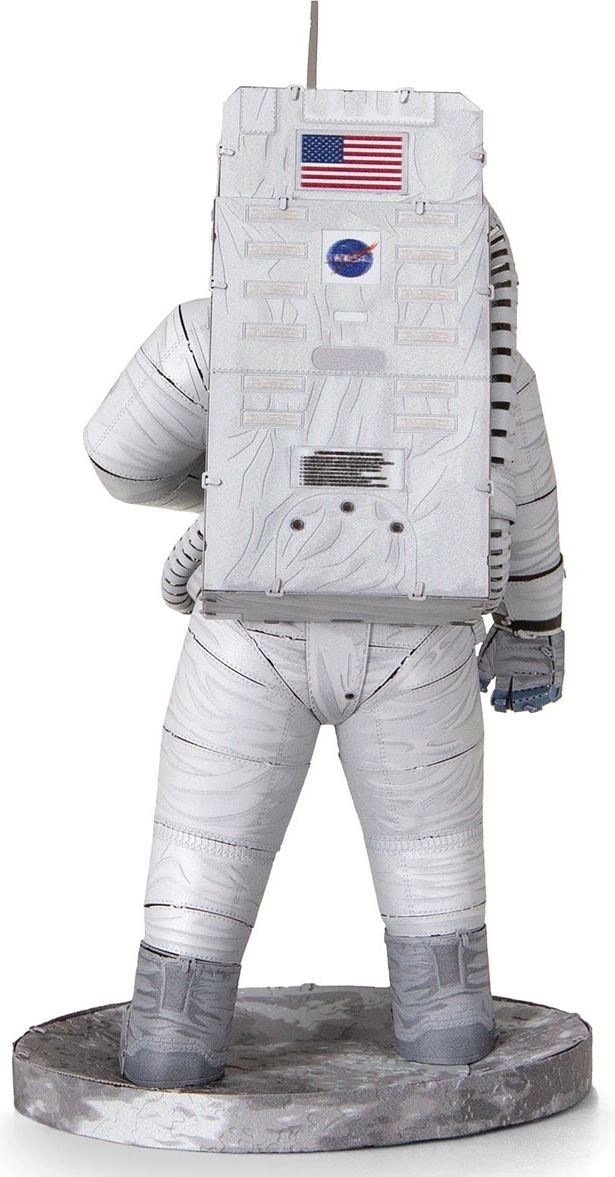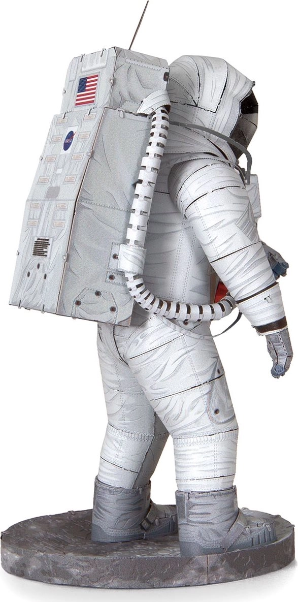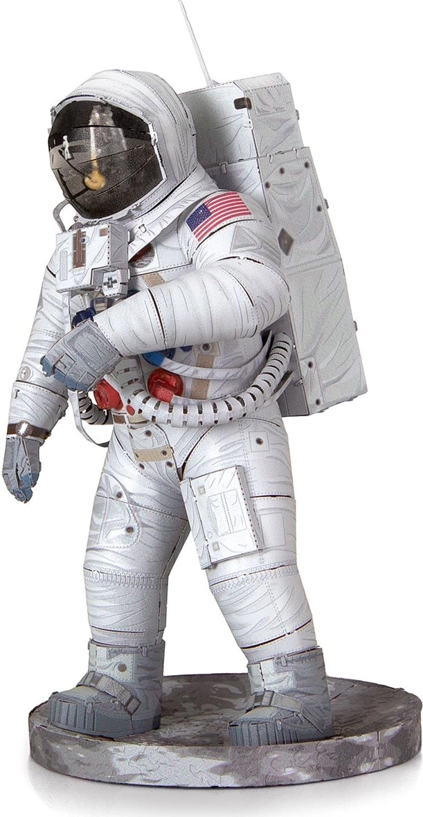 Découvrez le plaisir de la modélisation métallique de précision avec la série premium METAL EARTH. À partir de plaques d’acier carrées et plates, vous assemblerez une miniature réaliste de l’astronaute d’Apollo 11 avec une gravure laser fine qui souligne chaque détail de la combinaison spatiale.