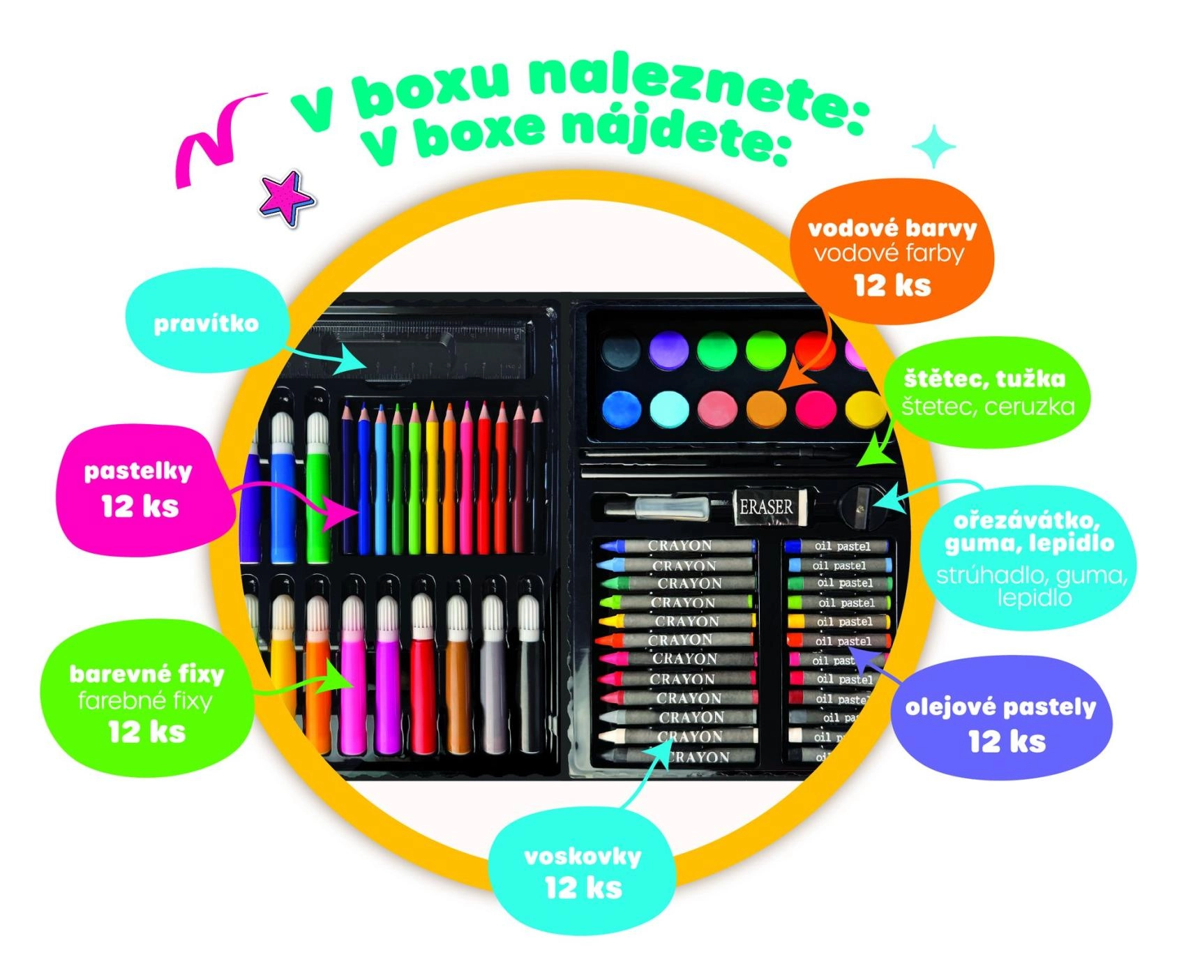 - Tout-en-un – crayons de couleur, feutres, aquarelles et autres accessoires pour peindre et dessiner.