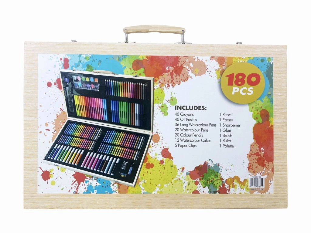 Découvrez une mallette de peinture en bois polyvalente, richement équipée pour les enfants, les écoliers et les adultes. Le set propose 180 pièces de fournitures artistiques pour le dessin, la peinture et la création – le tout rangé de façon claire dans une pratique mallette en bois, idéale à la maison, à l’école et en voyage.