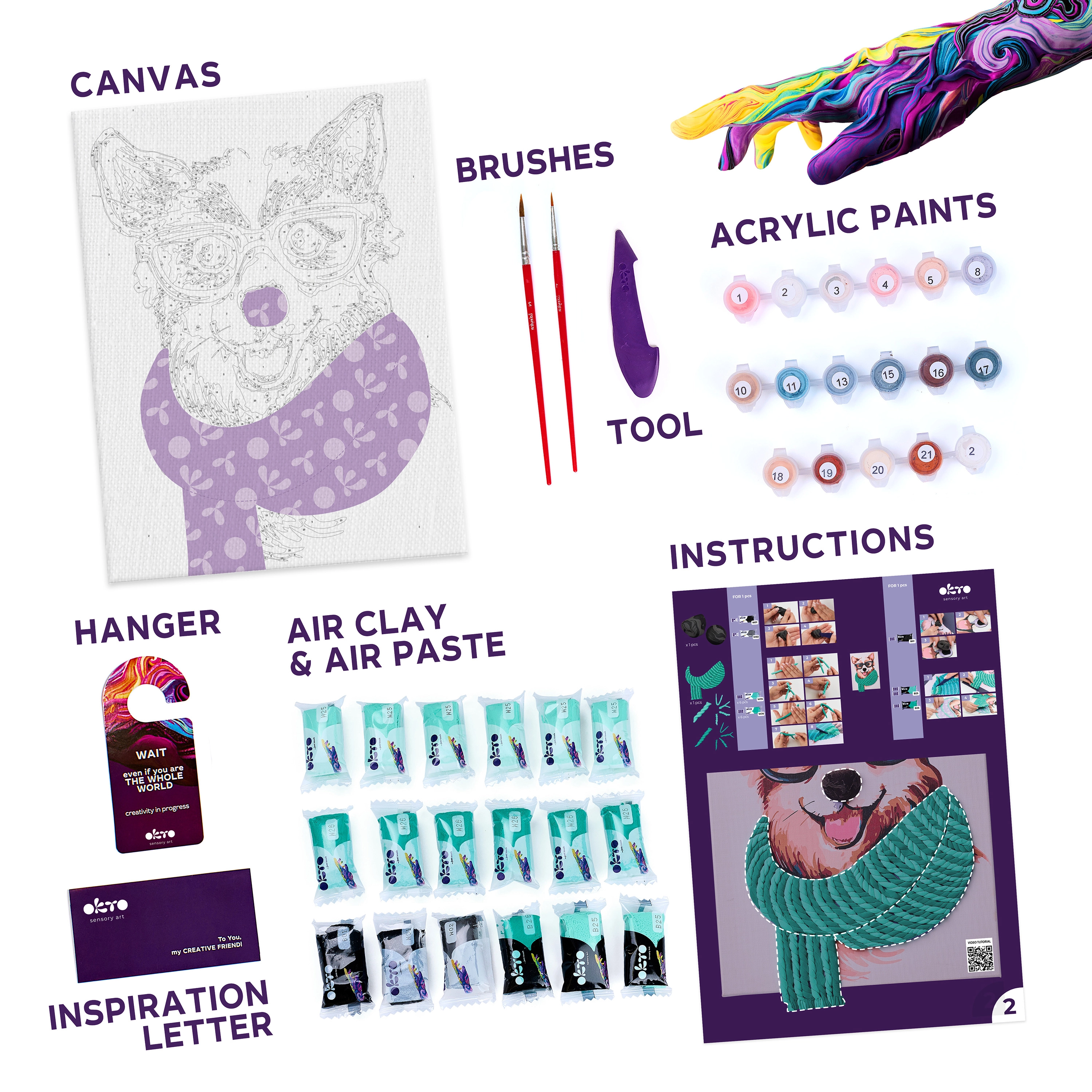 - Toile, notice illustrée, outil de modelage, pâte de modelage autodurcissante, set de peintures acryliques, pinceau