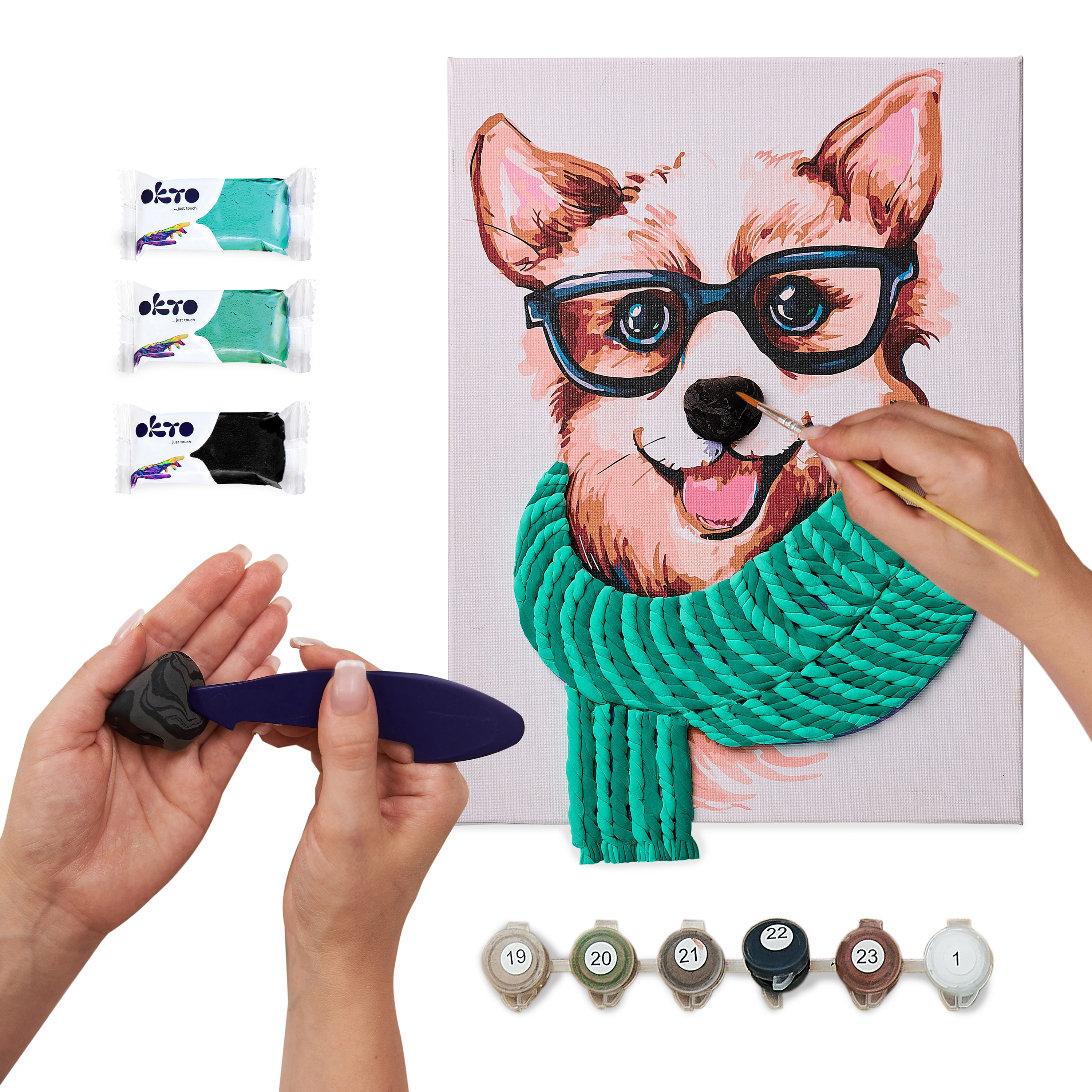 Créez une décoration originale avec le kit créatif OKTO – peinture par numéros et modélisation 3D en un seul coffret. Sur une toile de 30 × 40 cm, coloriez le motif stylé Fashion Corgi et façonnez un élément 3D en relief à l’aide d’une pâte autodurcissante. Idéal pour se détendre, développer la motricité fine et comme cadeau pour les amateurs de loisirs créatifs.