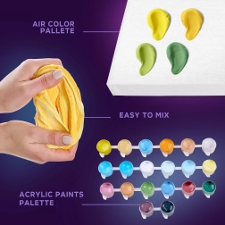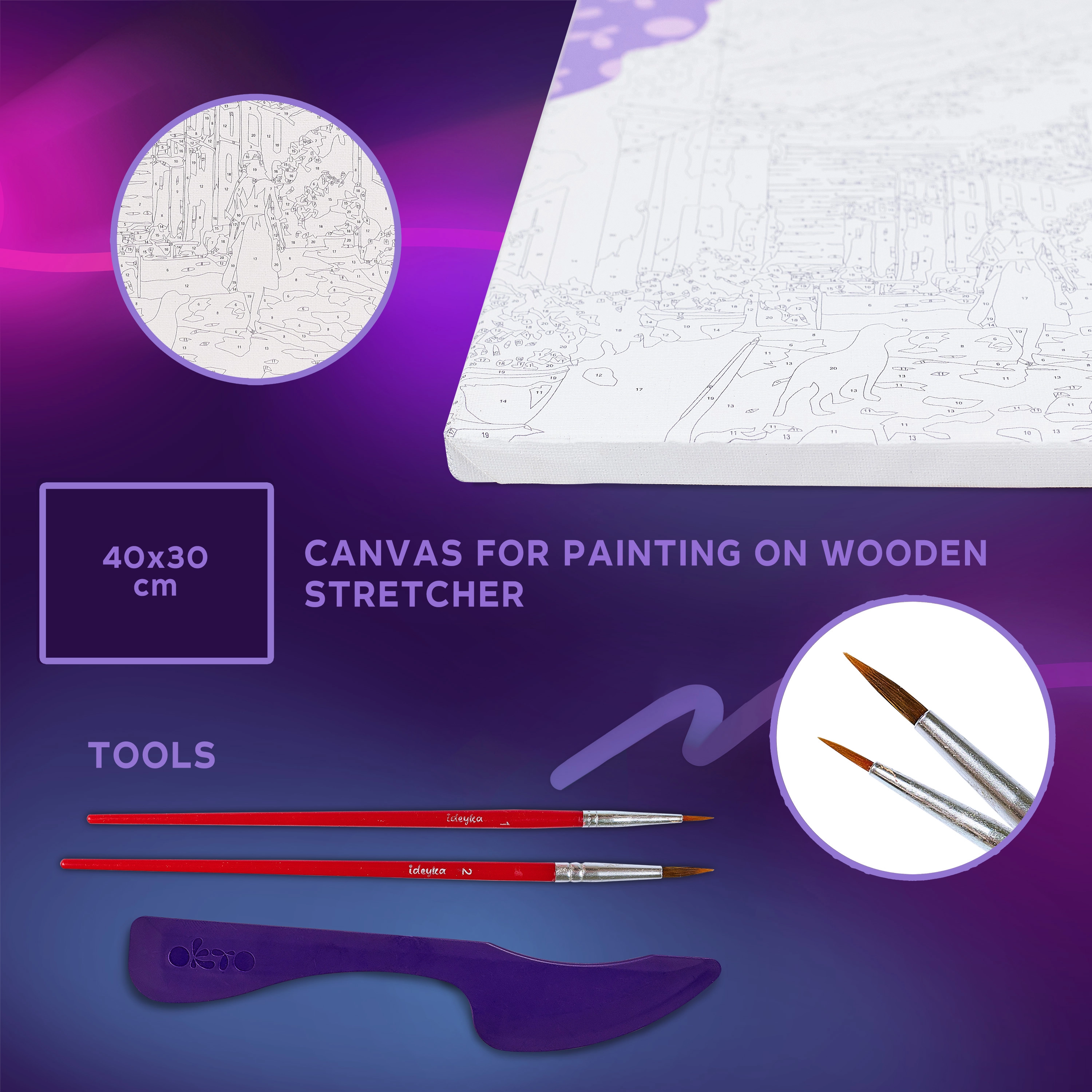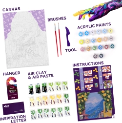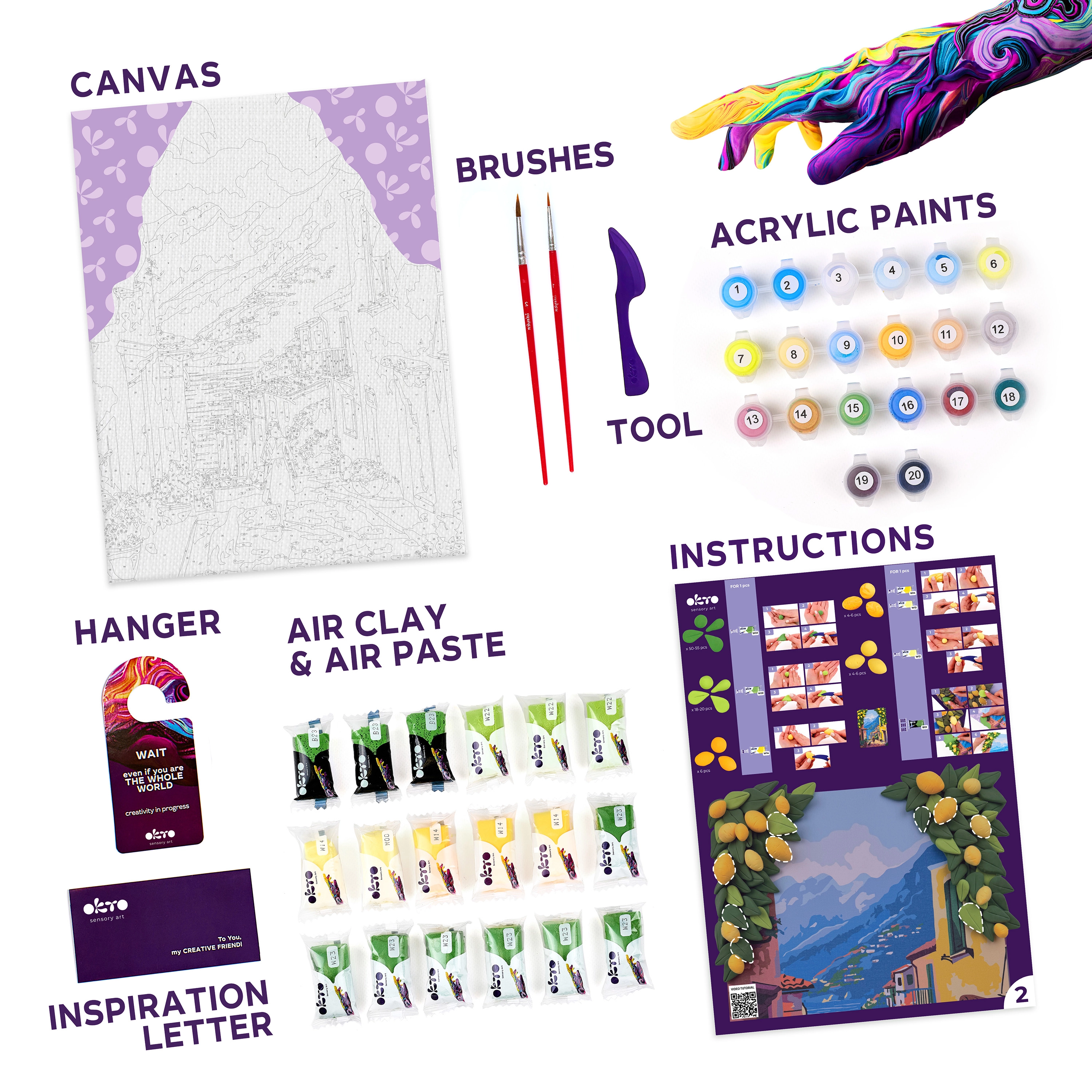 L’emballage contient tout le nécessaire pour créer — de la toile préimprimée aux peintures, en passant par la pâte à modeler et les outils. La procédure est simple et accessible même aux débutants complets.