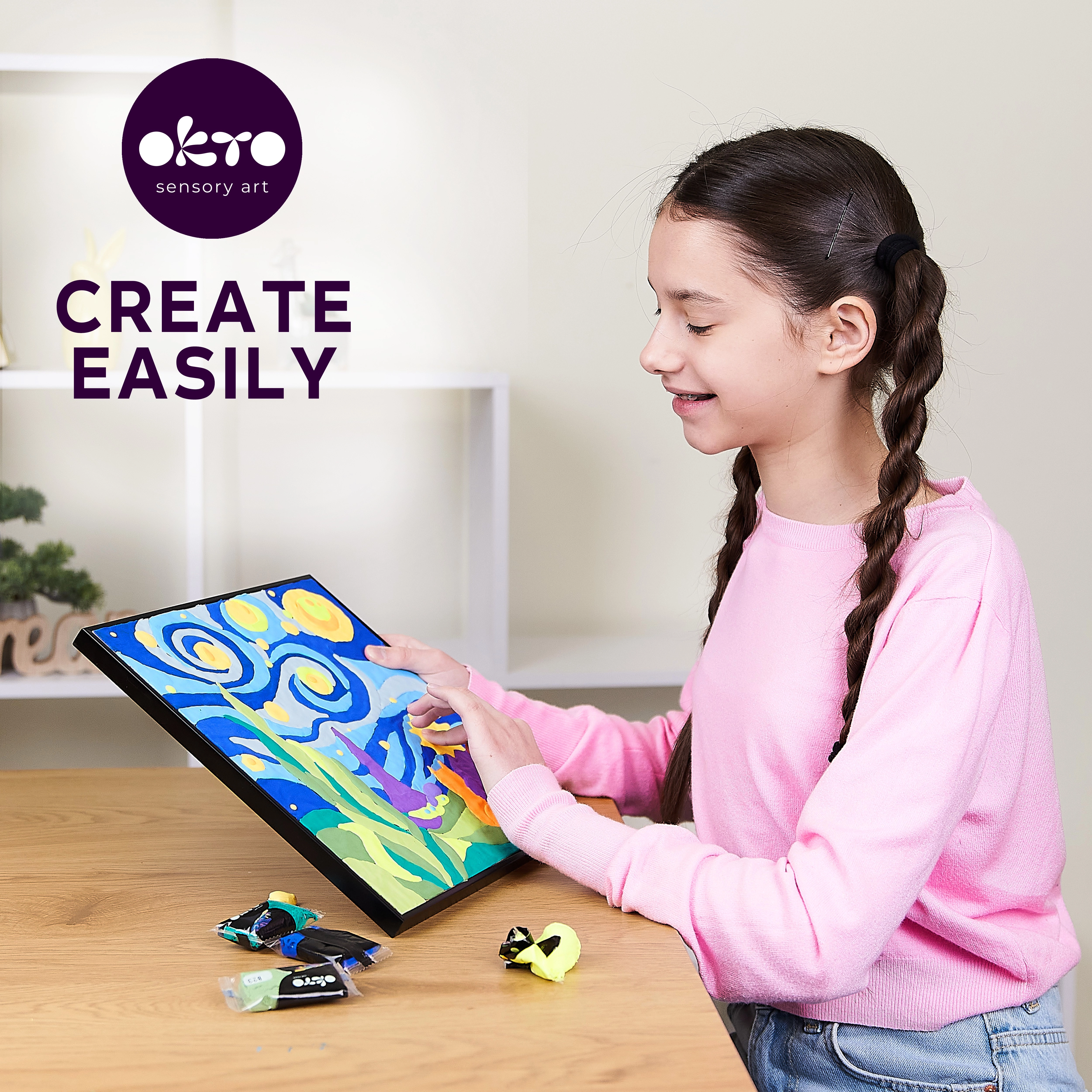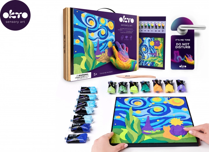 La boîte contient tout ce dont vous avez besoin – toile 29 × 29 cm, guide illustré, outil de modelage et ensemble de 14 pâtes de modelage colorées. Il suffit de suivre les numéros, de façonner et d’appliquer la pâte sur les zones indiquées. L’image terminée est parfaite comme décoration pour une chambre d’enfant ou comme cadeau original.