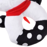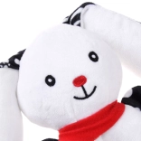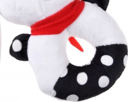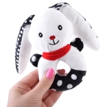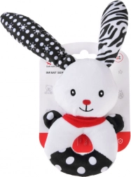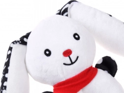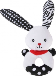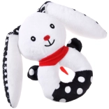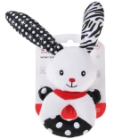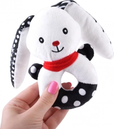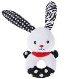 Ce jouet contrasté et moelleux combine les fonctions de hochet, sifflet et premier doudou. Sa forme ronde facile à saisir, avec une ouverture centrale, une tête en relief et de longues oreilles, aide à entraîner la motricité fine et la coordination œil-main. Les motifs noir et blanc contrastés sont parfaitement visibles pour les bébés et captent leur attention.