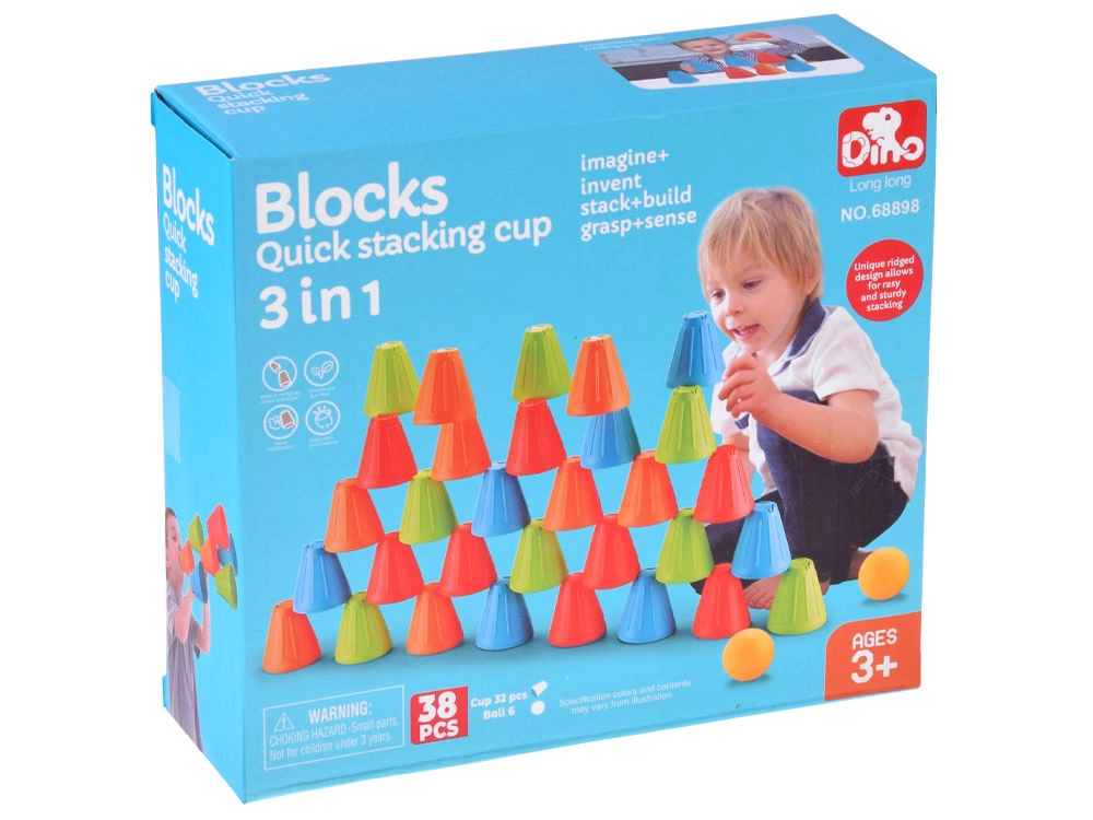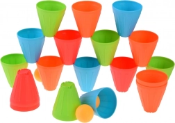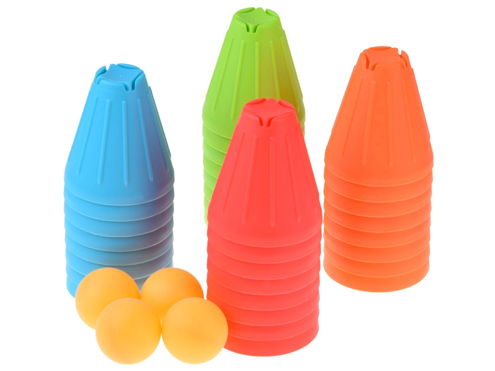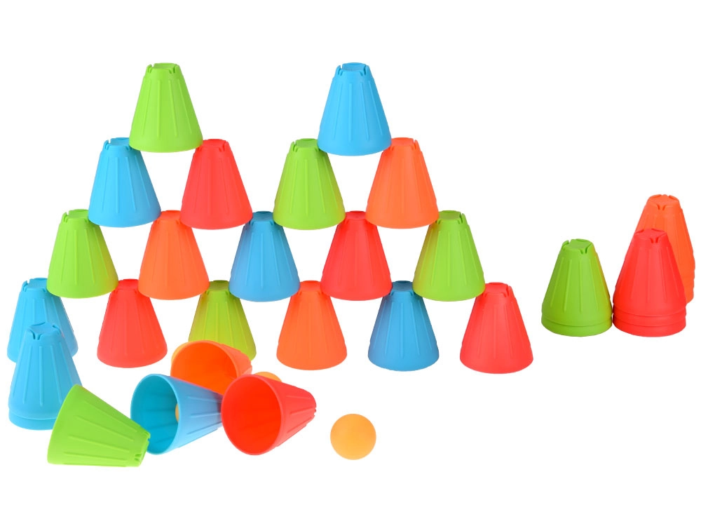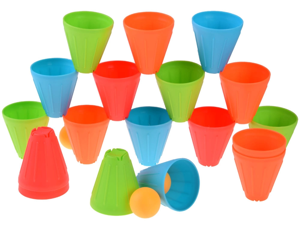 Les gobelets peuvent être utilisés comme jeu d’adresse – les enfants peuvent construire des tours et des pistes, déplacer ou retourner les gobelets contre la montre, ou lancer les balles légères sur des cibles marquées. Le jeu stimule la coordination œil–main, la concentration et les réflexes, tout en développant la pensée créative lors de la conception de constructions et de défis originaux.