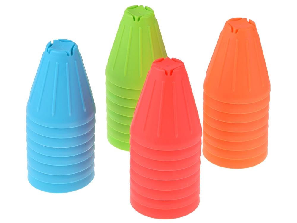 Cet ensemble polyvalent offre aux enfants des heures de jeu actif. Les gobelets coniques aux couleurs vives (vert, bleu, orange, rouge) sont légers, résistants et, grâce à leur forme, se superposent et s’emboîtent à merveille. La surface rainurée extérieure améliore la prise en main, tandis que les cavités intérieures moulées facilitent un assemblage stable des éléments.