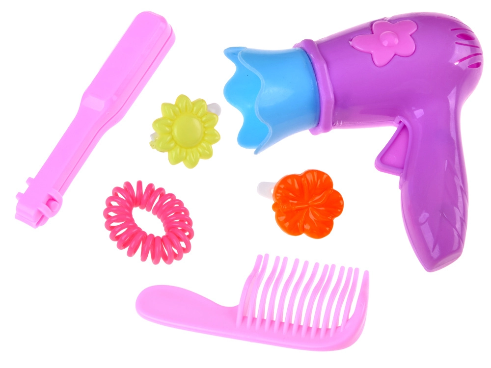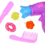 tête à coiffer, peigne, sèche-cheveux jouet, fer à lisser, élastique pour cheveux, 2 barrettes