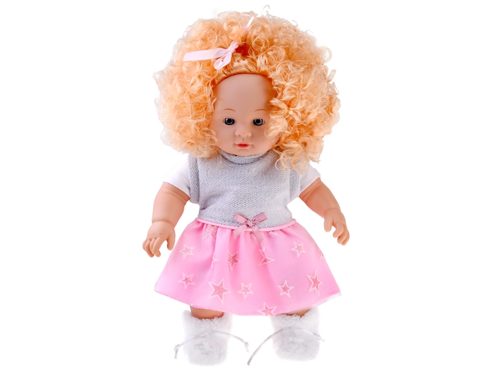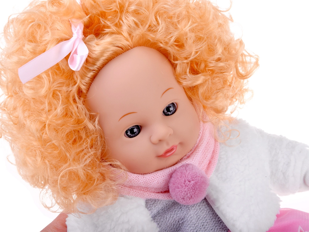 La tenue hivernale comprend : une petite robe rose-gris à étoiles, un manteau blanc tout doux, une écharpe rose à pompon et des chaussons moelleux. Le module sonore intégré reproduit plusieurs expressions enfantines, rendant le jeu encore plus interactif et réaliste.