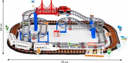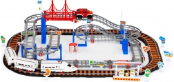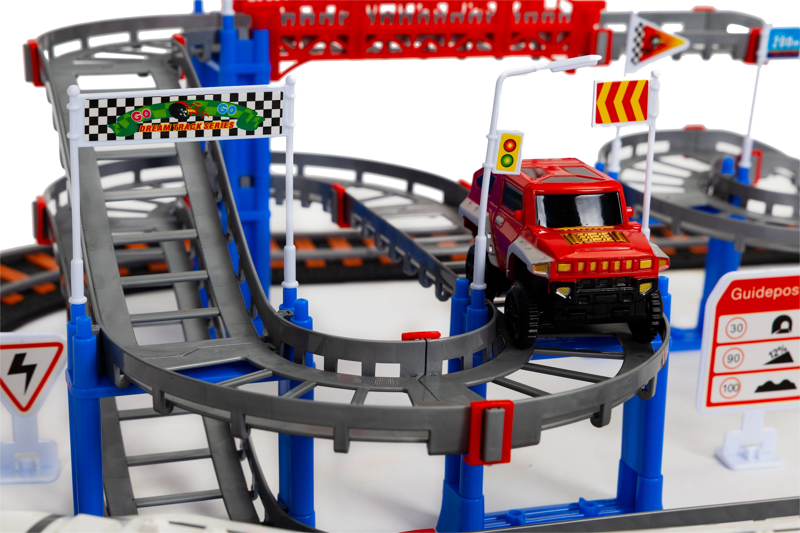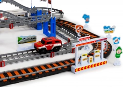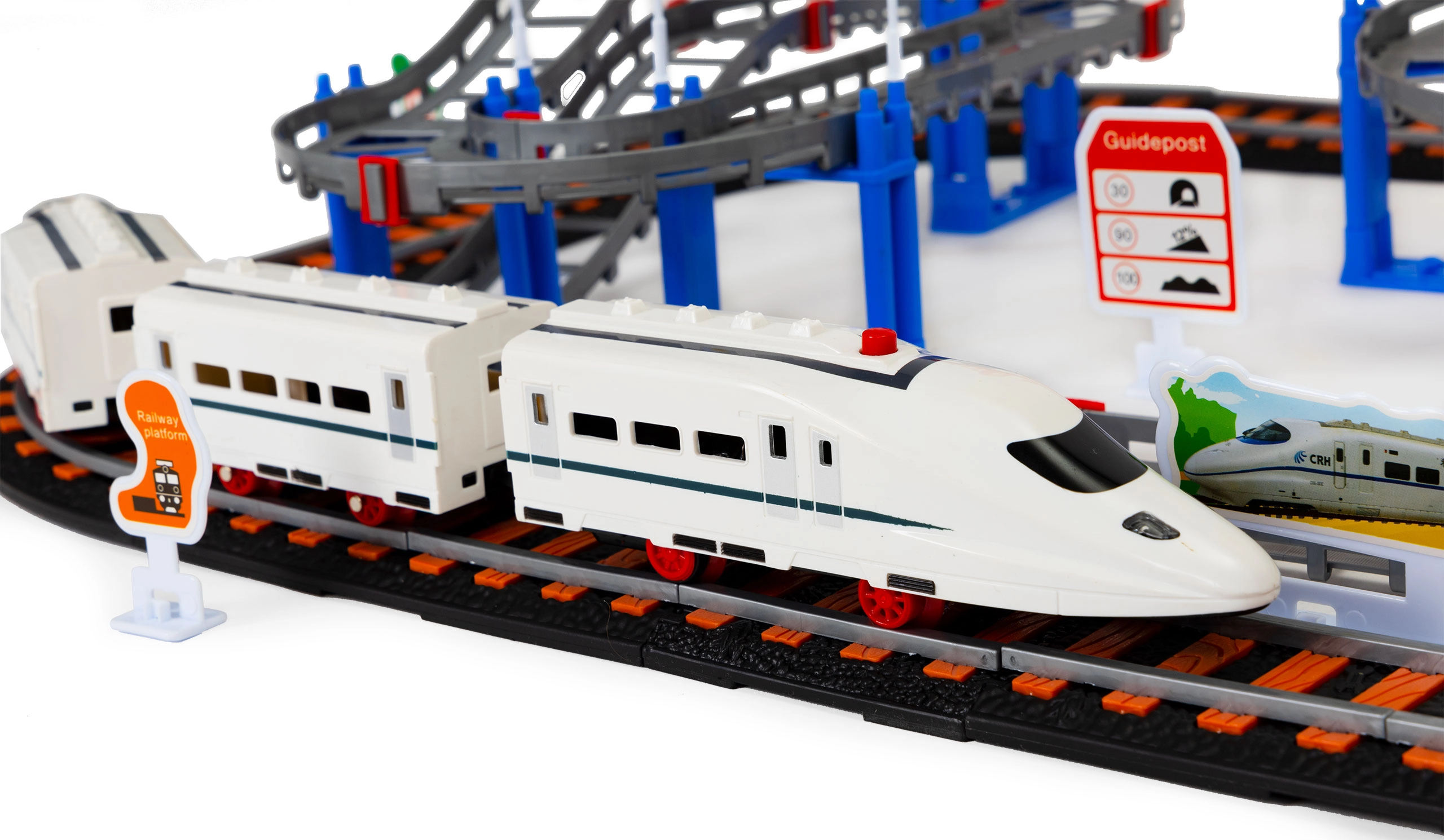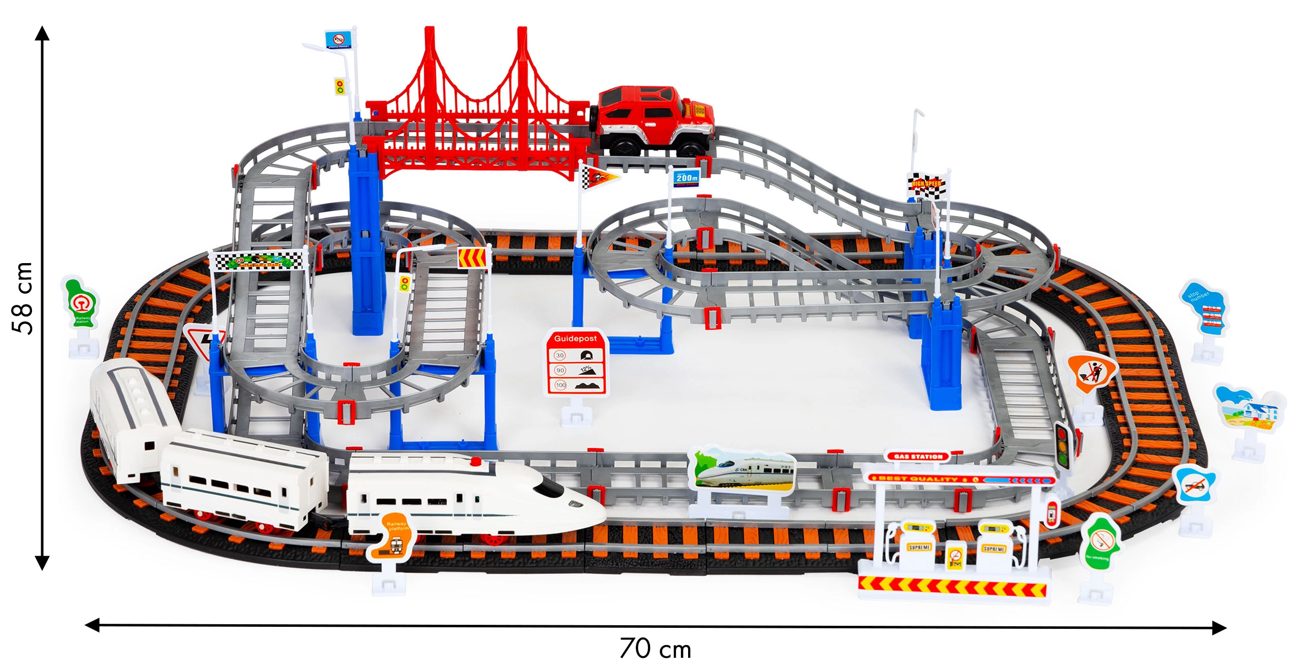 Construisez des spirales, des franchissements et des descentes. Des supports robustes maintiennent la voie stable et le passage sur le pont rouge est toujours le point culminant de la course.