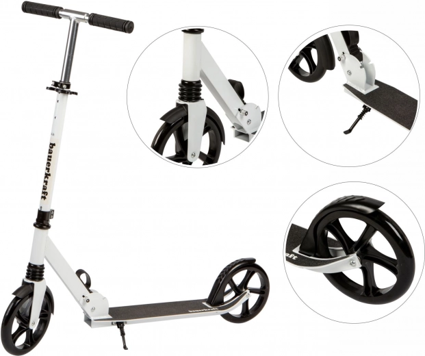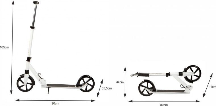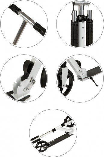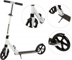 Trottinette urbaine légère et résistante pour enfants et adolescents, avec guidon réglable 95–105 cm, grandes roues 200 mm avec roulements ABEC-7, suspension avant et châssis pliable en aluminium. Pour une conduite sûre, elle dispose d’un frein arrière à pédale, d’un plateau antidérapant et de poignées ergonomiques. Charge maximale 80 kg.