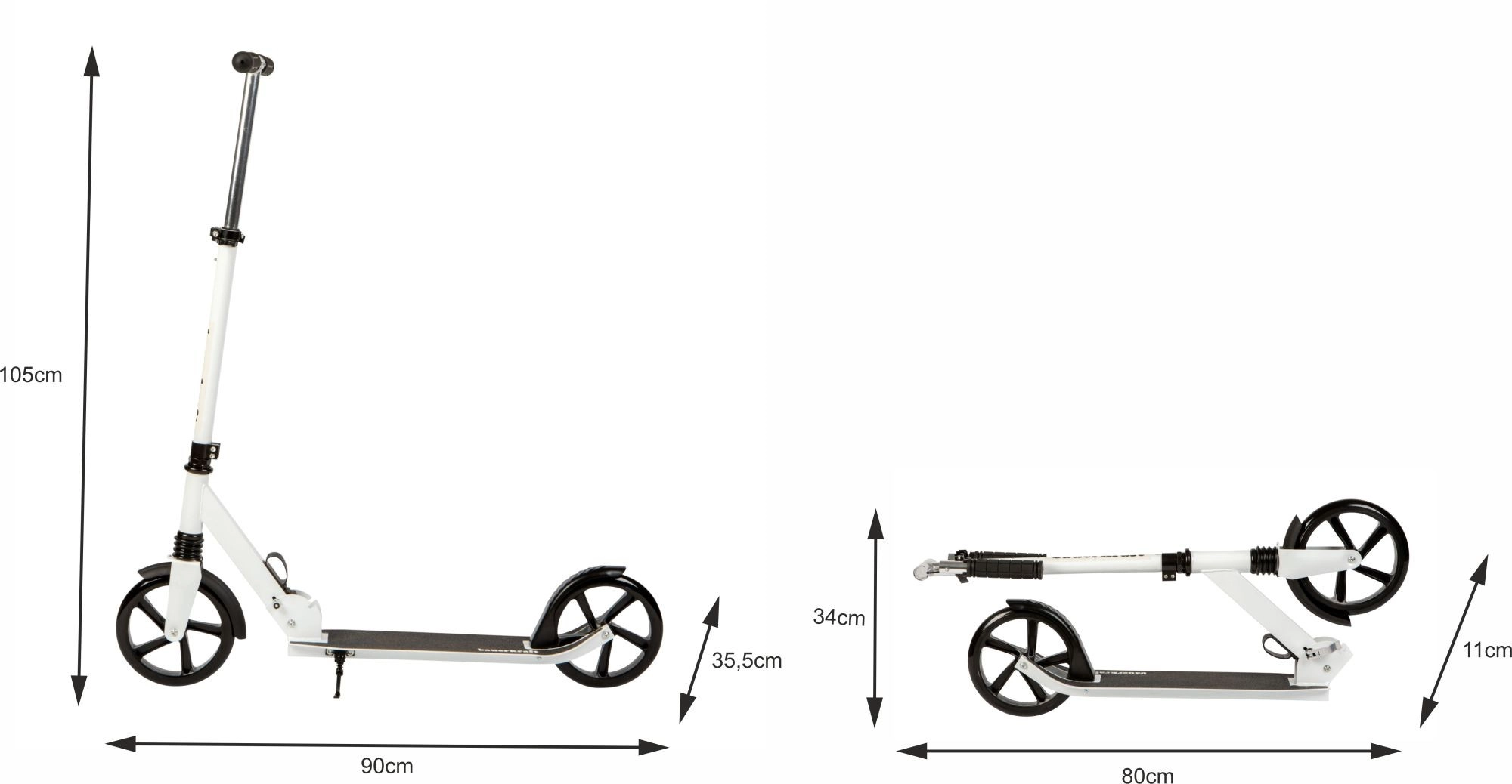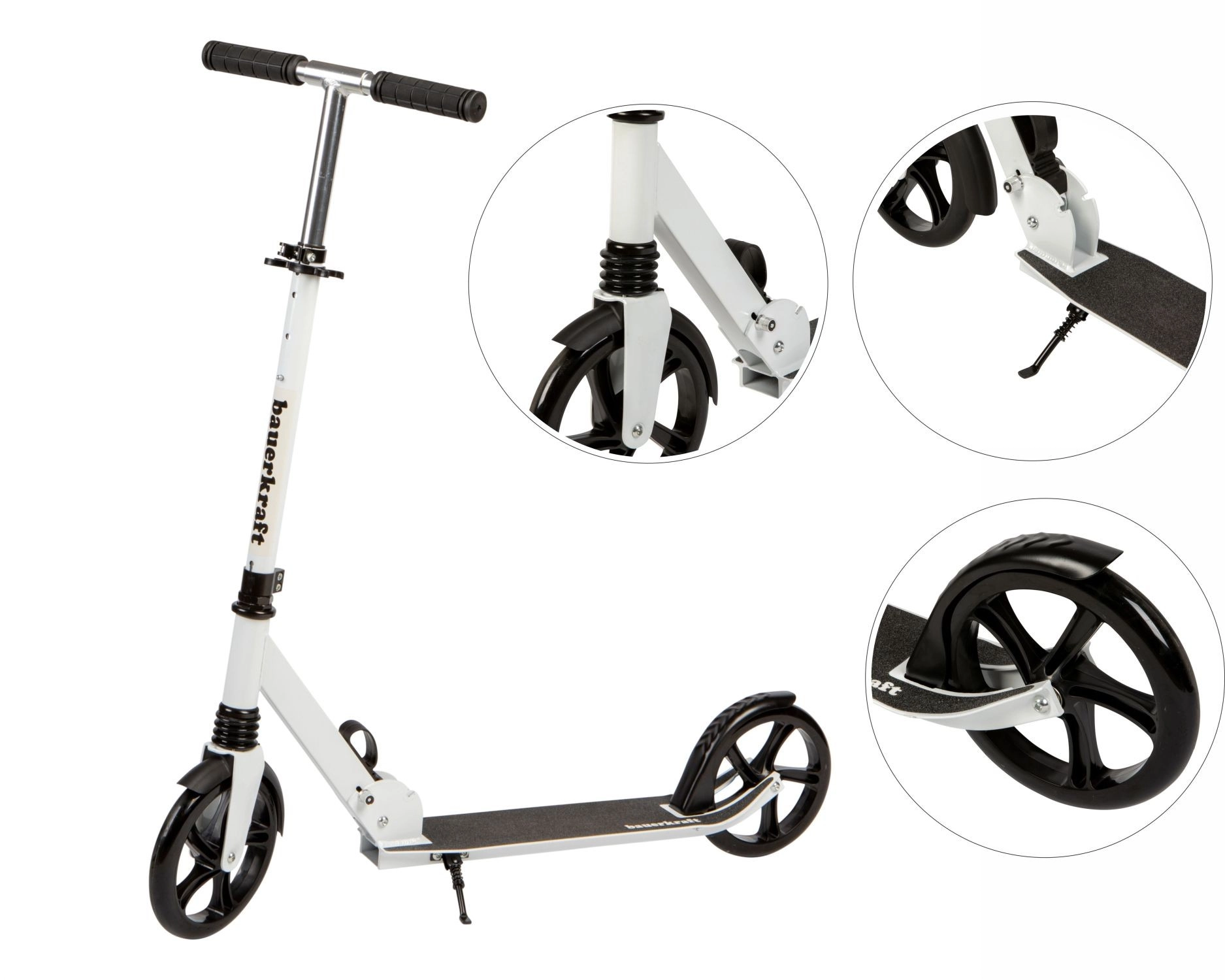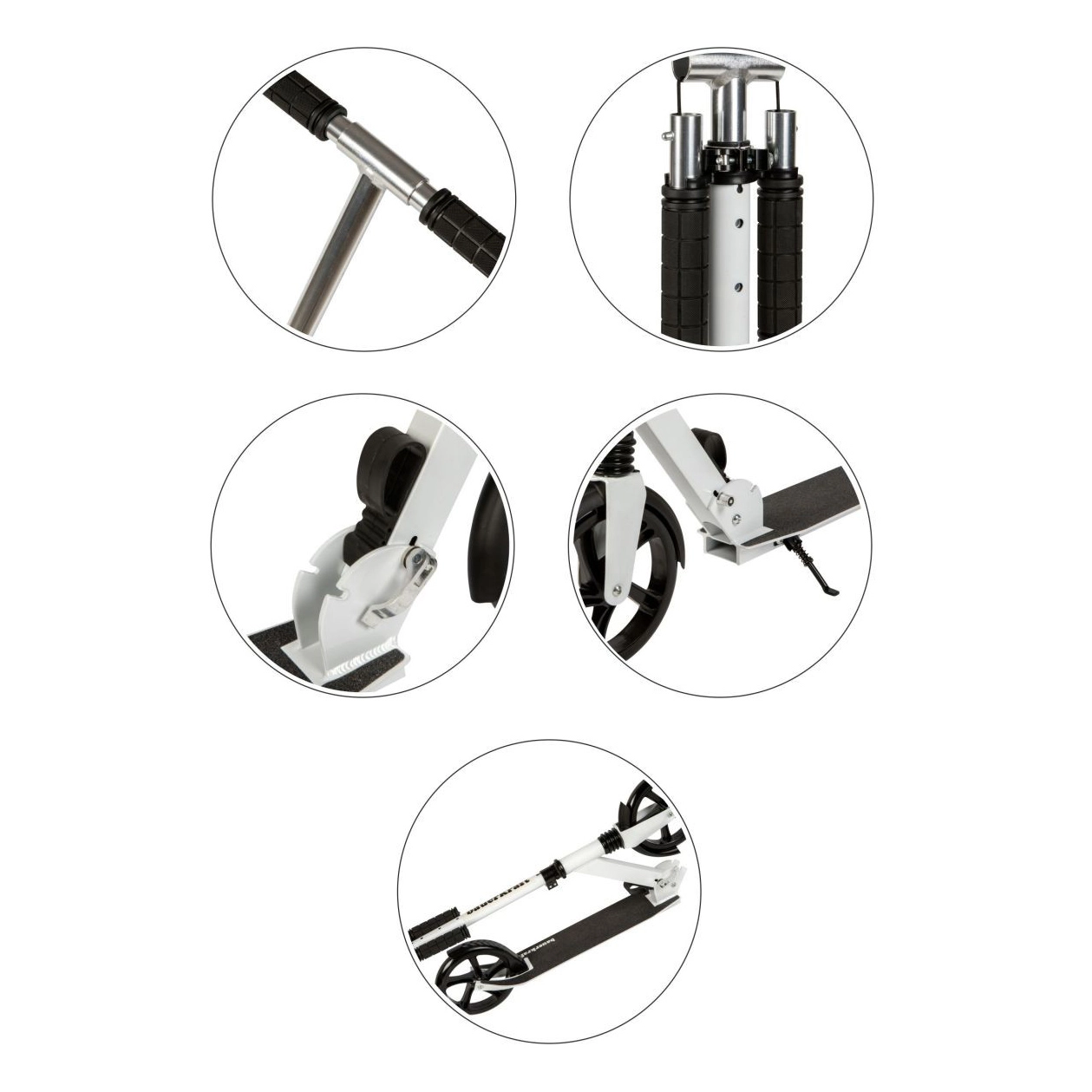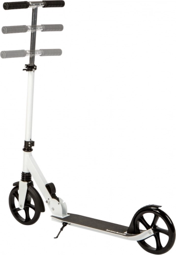 Pour la sécurité et le confort, elle est équipée d’un frein arrière à pédale avec garde-boue, d’un revêtement de plateau antidérapant et de poignées ergonomiques pour une prise en main sûre. Le réglage en trois étapes de la hauteur du guidon 95–105 cm assure une position correcte et la trottinette « grandit » avec le pilote.