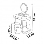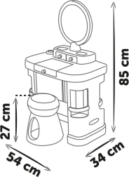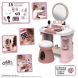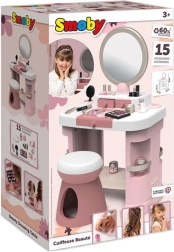 L’ensemble comprend 15 accessoires – des « rouges à lèvres » à mécanisme aux vernis à ongles et à la palette de fards, en passant par le peigne, la brosse et la bague. Tous les éléments cosmétiques sont de simples imitations, pour un jeu sûr et adapté aux enfants. La structure fabriquée par soufflage garantit une grande rigidité et une longue durée de vie. De plus, la coiffeuse peut aisément être convertie en version de table pour gagner de la place.
