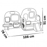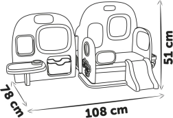 Il comprend une petite salle de bain avec toilettes, lavabo et porte-papier, un lit superposé séparé avec toboggan pour la sieste, une zone repas et créative avec une petite ardoise effaçable à sec, ainsi qu’un coffre de rangement pour les accessoires. Après le jeu, l’ensemble du centre se plie facilement et, grâce à la poignée, se transporte ou se range en toute commodité.