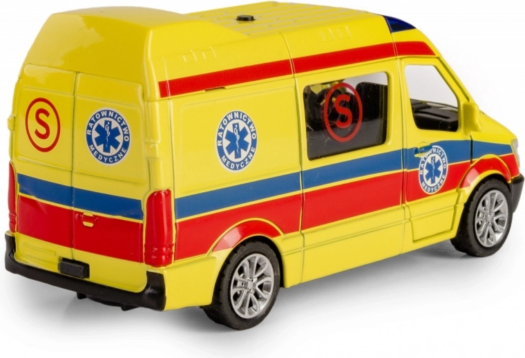 Modèle d’ambulance en métal de type fourgon avec éléments en plastique, doté d’un mécanisme à rétrofriction (pull-back), de portes ouvrantes et d’effets lumineux et sonores. Un excellent choix pour les jeunes passionnés des services de secours et les collectionneurs.