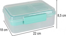 Lunch box pratique et spacieux d’un volume de 2200 ml pour le travail, l’école et les voyages. Grâce à la répartition bien pensée des compartiments et au gobelet séparé pour sauce (150 ml), vos repas restent frais, les saveurs ne se mélangent pas et tout demeure bien fermé grâce au joint en silicone et au clip solide. Fabriqué en matériau sans BPA, compatible lave-vaisselle et micro-ondes.
