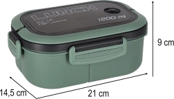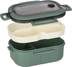 Lunch box pratique 1200 ml avec trois compartiments et un couvercle hermétique à 4 clips pour garder le repas frais et séparé. Comprend un plateau amovible, une fourchette et une cuillère. Compatible lave-vaisselle et micro-ondes (sans couvercle), en plastique sans BPA.
